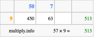 That's all there is to it! As you can see from the box above, the answer to 57 times 9 using the box method is 513.