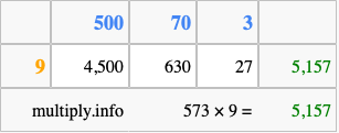 That's all there is to it! As you can see from the box above, the answer to 573 times 9 using the box method is 5,157.