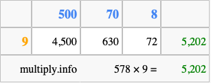 That's all there is to it! As you can see from the box above, the answer to 578 times 9 using the box method is 5,202.