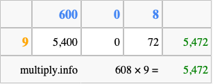 That's all there is to it! As you can see from the box above, the answer to 608 times 9 using the box method is 5,472.