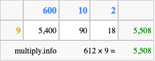 Below is an illustration showing you how to calculate 612 times 9 using the box method, using the instructions above.