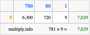 Below is an illustration showing you how to calculate 781 times 9 using the box method, using the instructions above.