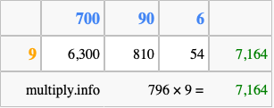 Below is an illustration showing you how to calculate 796 times 9 using the box method, using the instructions above.