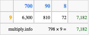 That's all there is to it! As you can see from the box above, the answer to 798 times 9 using the box method is 7,182.