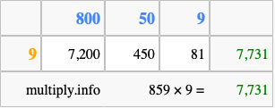 That's all there is to it! As you can see from the box above, the answer to 859 times 9 using the box method is 7,731.
