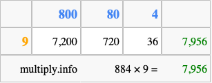 Below is an illustration showing you how to calculate 884 times 9 using the box method, using the instructions above.