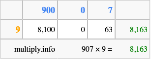 Below is an illustration showing you how to calculate 907 times 9 using the box method, using the instructions above.