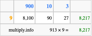 Below is an illustration showing you how to calculate 913 times 9 using the box method, using the instructions above.