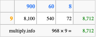 Below is an illustration showing you how to calculate 968 times 9 using the box method, using the instructions above.