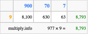 That's all there is to it! As you can see from the box above, the answer to 977 times 9 using the box method is 8,793.