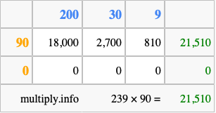 That's all there is to it! As you can see from the box above, the answer to 239 times 90 using the box method is 21,510.