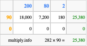 Below is an illustration showing you how to calculate 282 times 90 using the box method, using the instructions above.
