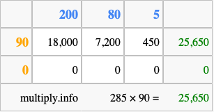 That's all there is to it! As you can see from the box above, the answer to 285 times 90 using the box method is 25,650.