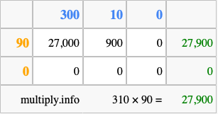 That's all there is to it! As you can see from the box above, the answer to 310 times 90 using the box method is 27,900.