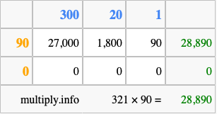 Finally, we add up all the sums we found in step 3 to get our final answer to 321 times 90.