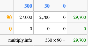 That's all there is to it! As you can see from the box above, the answer to 330 times 90 using the box method is 29,700.
