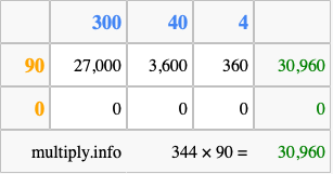 Below is an illustration showing you how to calculate 344 times 90 using the box method, using the instructions above.
