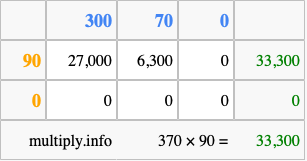 That's all there is to it! As you can see from the box above, the answer to 370 times 90 using the box method is 33,300.