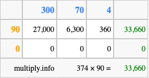 That's all there is to it! As you can see from the box above, the answer to 374 times 90 using the box method is 33,660.