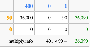 That's all there is to it! As you can see from the box above, the answer to 401 times 90 using the box method is 36,090.