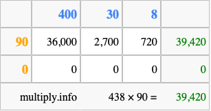 That's all there is to it! As you can see from the box above, the answer to 438 times 90 using the box method is 39,420.