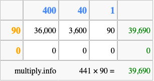 That's all there is to it! As you can see from the box above, the answer to 441 times 90 using the box method is 39,690.