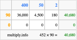 That's all there is to it! As you can see from the box above, the answer to 452 times 90 using the box method is 40,680.