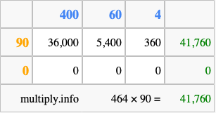 That's all there is to it! As you can see from the box above, the answer to 464 times 90 using the box method is 41,760.