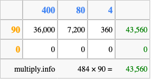 That's all there is to it! As you can see from the box above, the answer to 484 times 90 using the box method is 43,560.