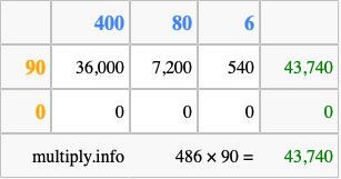 That's all there is to it! As you can see from the box above, the answer to 486 times 90 using the box method is 43,740.