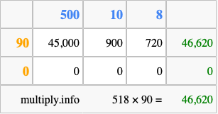 Below is an illustration showing you how to calculate 518 times 90 using the box method, using the instructions above.