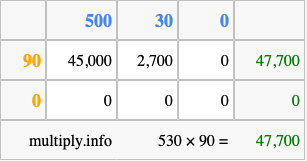 Below is an illustration showing you how to calculate 530 times 90 using the box method, using the instructions above.