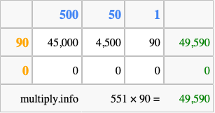 Below is an illustration showing you how to calculate 551 times 90 using the box method, using the instructions above.