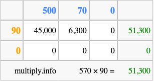 That's all there is to it! As you can see from the box above, the answer to 570 times 90 using the box method is 51,300.