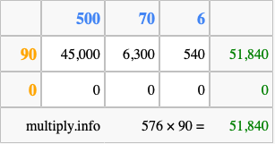 That's all there is to it! As you can see from the box above, the answer to 576 times 90 using the box method is 51,840.