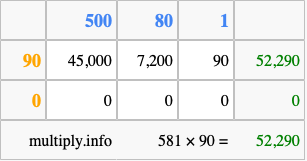 Below is an illustration showing you how to calculate 581 times 90 using the box method, using the instructions above.