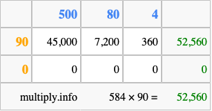 Below is an illustration showing you how to calculate 584 times 90 using the box method, using the instructions above.