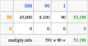 Below is an illustration showing you how to calculate 591 times 90 using the box method, using the instructions above.
