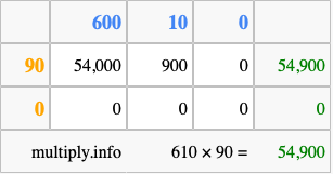 That's all there is to it! As you can see from the box above, the answer to 610 times 90 using the box method is 54,900.