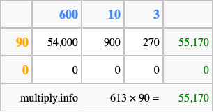 That's all there is to it! As you can see from the box above, the answer to 613 times 90 using the box method is 55,170.