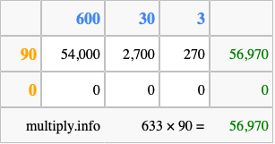 That's all there is to it! As you can see from the box above, the answer to 633 times 90 using the box method is 56,970.