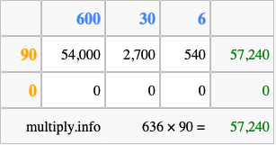 That's all there is to it! As you can see from the box above, the answer to 636 times 90 using the box method is 57,240.