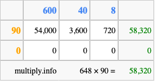 That's all there is to it! As you can see from the box above, the answer to 648 times 90 using the box method is 58,320.