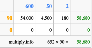 That's all there is to it! As you can see from the box above, the answer to 652 times 90 using the box method is 58,680.