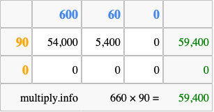 Below is an illustration showing you how to calculate 660 times 90 using the box method, using the instructions above.