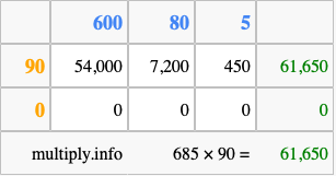 Below is an illustration showing you how to calculate 685 times 90 using the box method, using the instructions above.