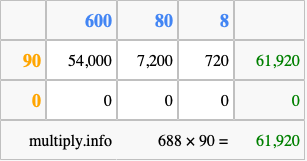 Below is an illustration showing you how to calculate 688 times 90 using the box method, using the instructions above.