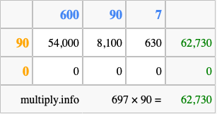 That's all there is to it! As you can see from the box above, the answer to 697 times 90 using the box method is 62,730.