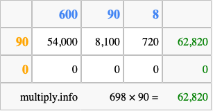 Below is an illustration showing you how to calculate 698 times 90 using the box method, using the instructions above.