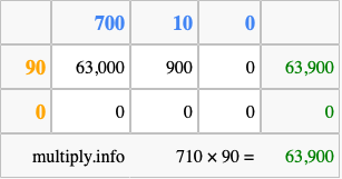Below is an illustration showing you how to calculate 710 times 90 using the box method, using the instructions above.